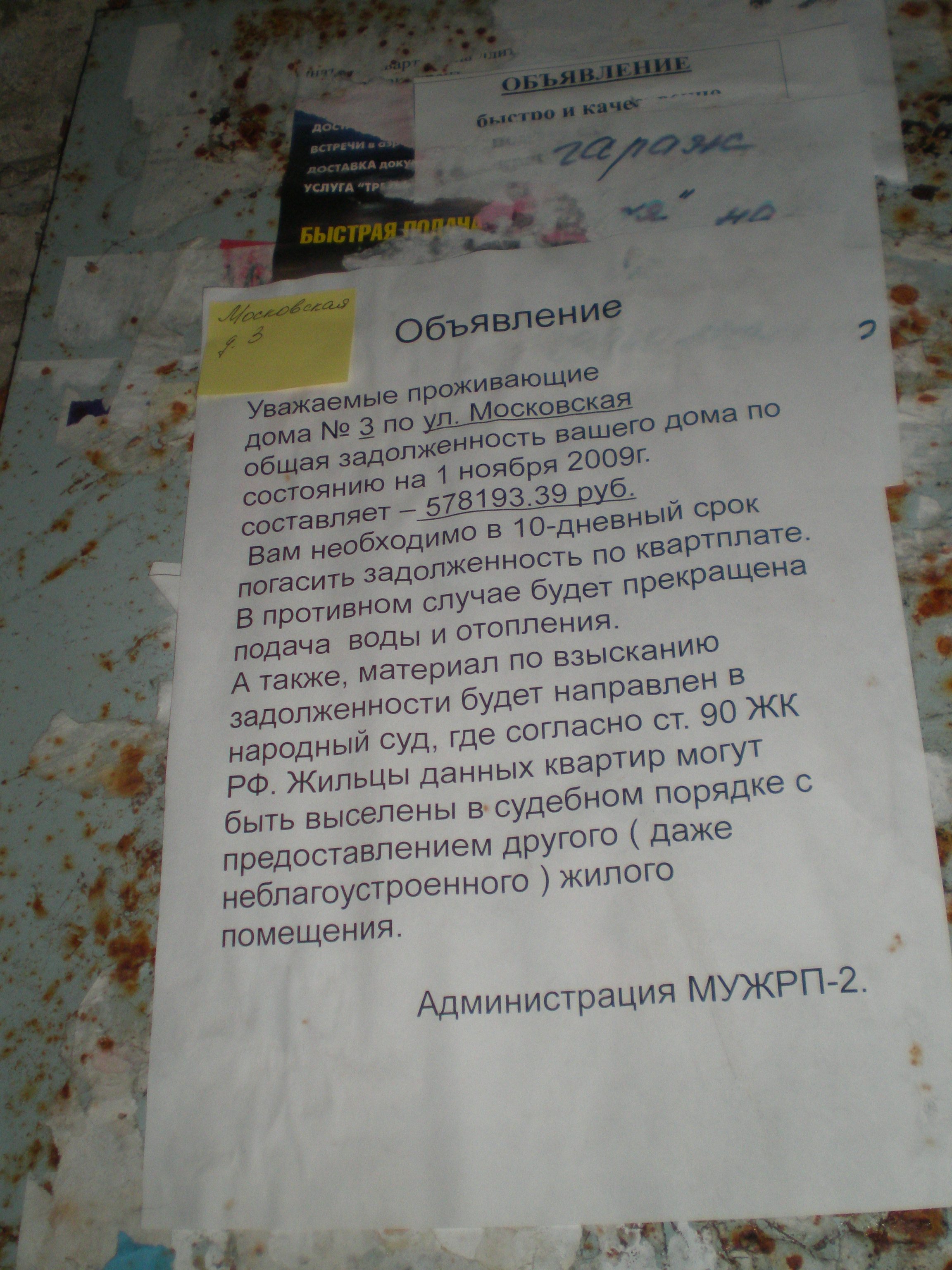 Такие листочки висят на каждом доме в микрорайоне. Оптом обращаться будут.VestelDVD писал(а):там долг всего 518 000 рублей, даже если они обратяться в суд, толку не будет