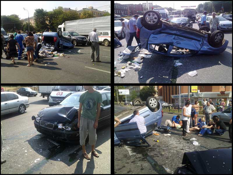 у роддома: перекресток, я стою поворачиваю налево, прямо едет девушка, пропускаю её.. справа на красный пролетает Вольва и не тормозя входит в синюю машину... все слава богу живы...