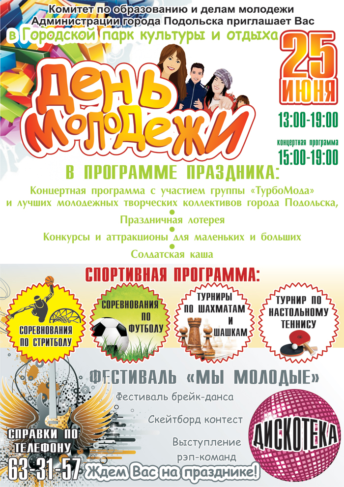 В Подольске праздновать тоже будут, в парке имени Талалихина.Приглашаем принять участие в районном празднике, посвященном Дню молодежи, который состоится в парке Победы поселка Кузнечики 25 июня 2011 года, начало в 15.00.