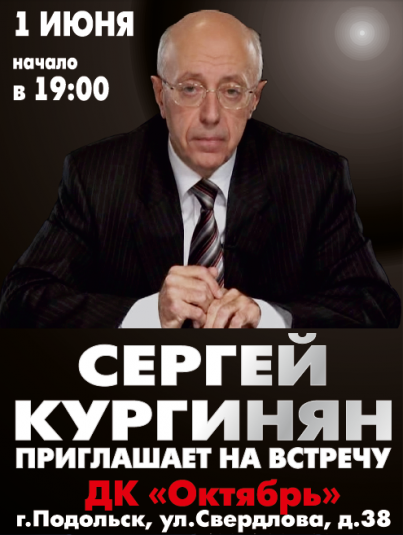 1 июня в 19:00, после открытия фотовыставки «20 лет без СССР», в большом зале ДК «Октябрь» по адресу: г. Подольск, ул. Свердлова, д. 38, состоится встреча с политологом Сергеем Кургиняном. Вход свободный. На встрече будет возможность задать вопросы Кургиняну и пообщаться с членами движения «Суть Времени».