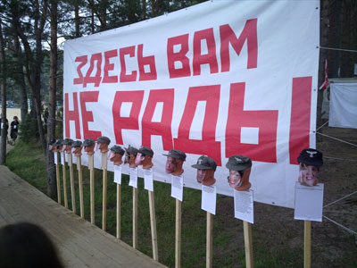 Очередной скандал случился на молодежном форуме ?Селигер?. Несколько дней подряд прогуливающихся по лагерю студентов встречали насаженные на колья пластиковые головы с прикрепленными к ним фотографиями правозащитниц Людмилы Алексеевой и Валерии Новодворской, музыканта Юрия Шевчука (который, напомним, дерзнул повести политическую дискуссию с Путиным), экс-главы ЮКОСа Михаила Ходорковского, члена Общественной палаты Николая Сванидзе? Причем каждая из нескольких десятков голов была одета в фуражку с фашистской символикой. Позорные столбы вскоре убрали, зато на месте до сих пор остаются огромные плакаты, разоблачающие все тех же ?врагов режима?.