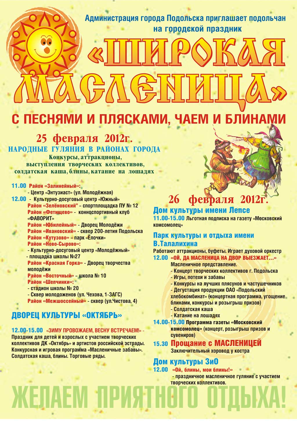 Вас ожидает шикарное шоу, выступление скоморохов, фольклёрных ансамблей, конкурсы с призами для детей и взрослых,