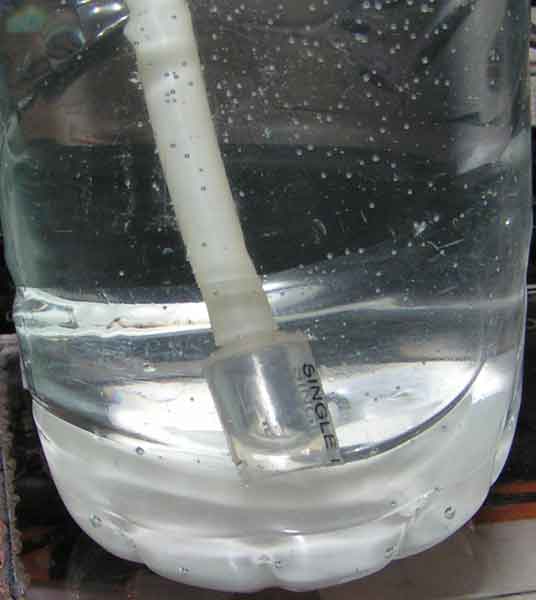 3. Газ идет ко дну меньшей бутылки наполненной водой. Это сразу и фильтр на случай если пойдет пена (бояться этого не надо) и счетчик пузырьков. Поскольку в нашем случае ограничивать количество пузырьков не возможно, эта информация нам нужна только для проверки работает ли система.