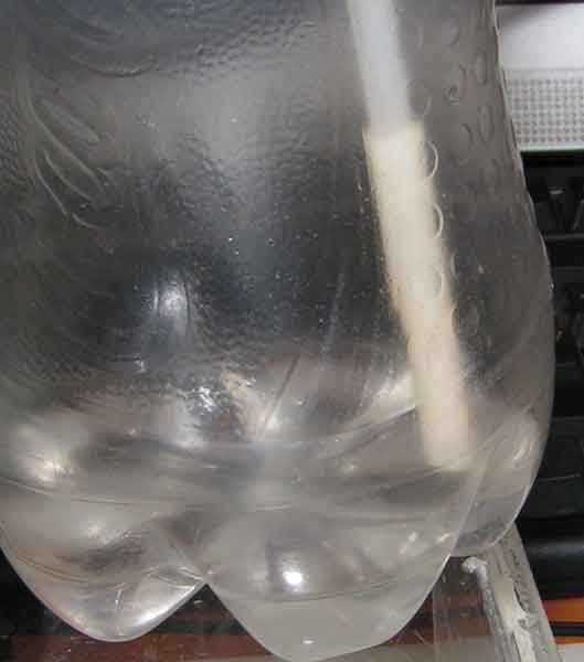 3. Газ идет ко дну меньшей бутылки наполненной водой. Это сразу и фильтр на случай если пойдет пена (бояться этого не надо) и счетчик пузырьков. Поскольку в нашем случае ограничивать количество пузырьков не возможно, эта информация нам нужна только для проверки работает ли система.