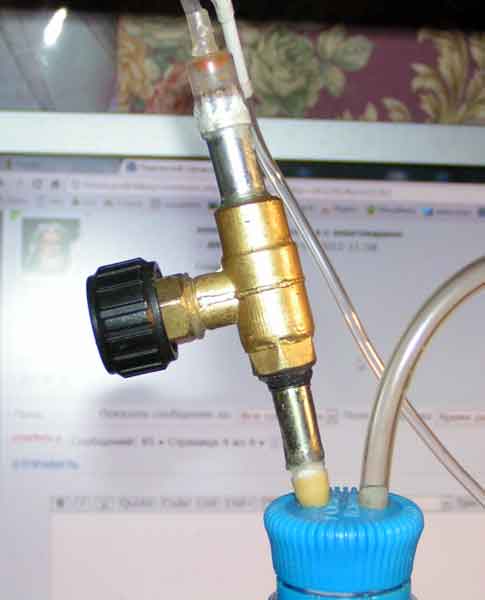 В нашей установке клапан делается из шприца. Применяется,как я понял,именно на больших бутылках,ибо реакция в них к концу идёт в разнос.
