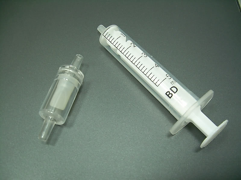 Контроль подачи газа. Делаем щётчик пузырьков. Для этого нужен шприц и обратный клапан. Обрезаем ушки у шприца,запихиваем в него клапан,наполовину заливаем глицерином или дисциллятом. На клапан одеваем шланг подачи газа,со шприца снимаем газ на реактор.