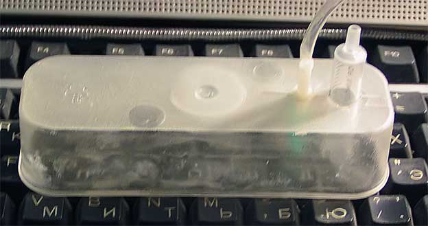 Короче,в широкогорлую бутылку с содой сунул в верх дном 50 грамовую бутылочку от каких то препаратов, с кислотой.В крышку от маленькой бутылочки вогнал отрезок инсулинового шприца.Дует потихоньку в 10 литров со светодиодами.