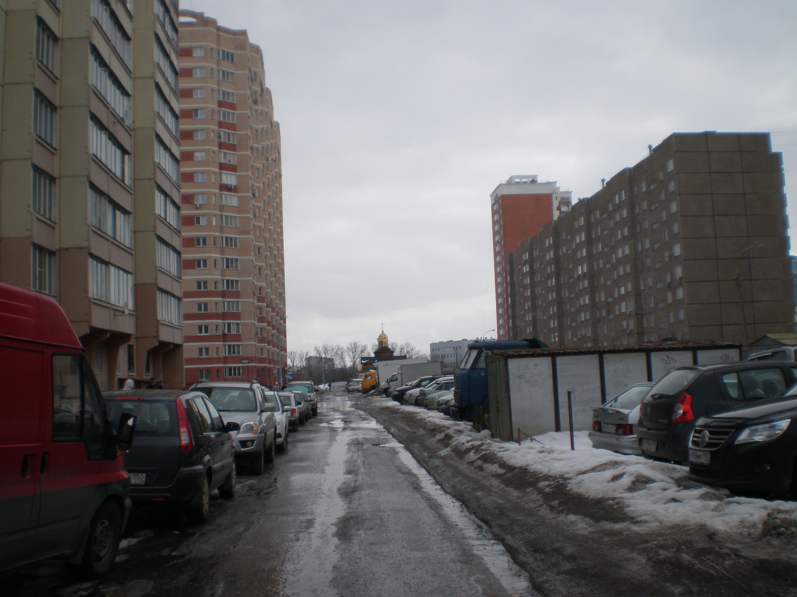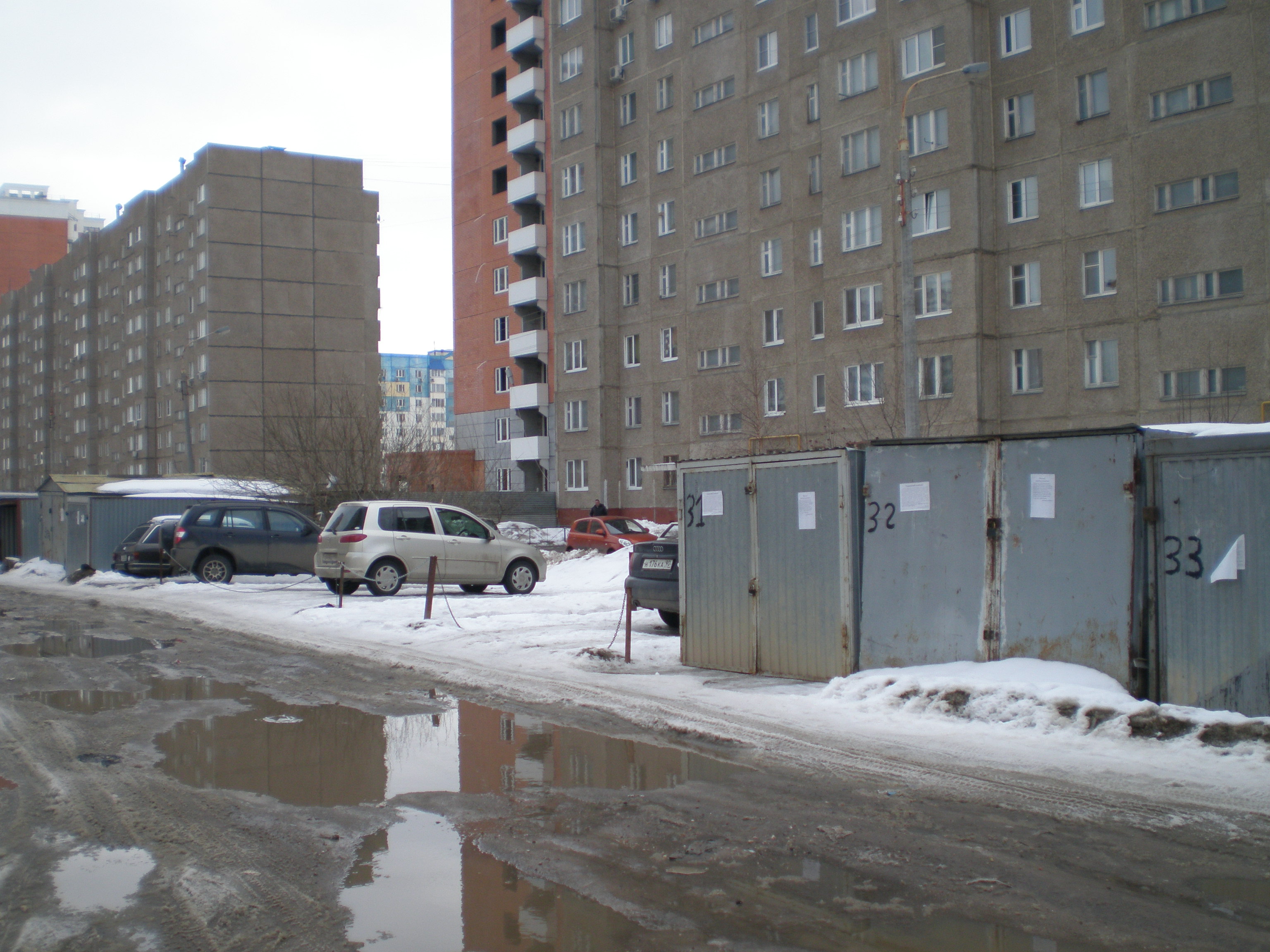 Фотография лужи во дворе (обратите внимание на колёса машин, они стоят на асфальте в положенных для парковки местах):