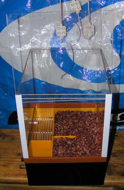 Вместо керамзита я засыпал отсев лавы,сверху кварц. Уровень протекающей воды - половина толщины субстрата. Освещение светодиодными модулями для рекламы.