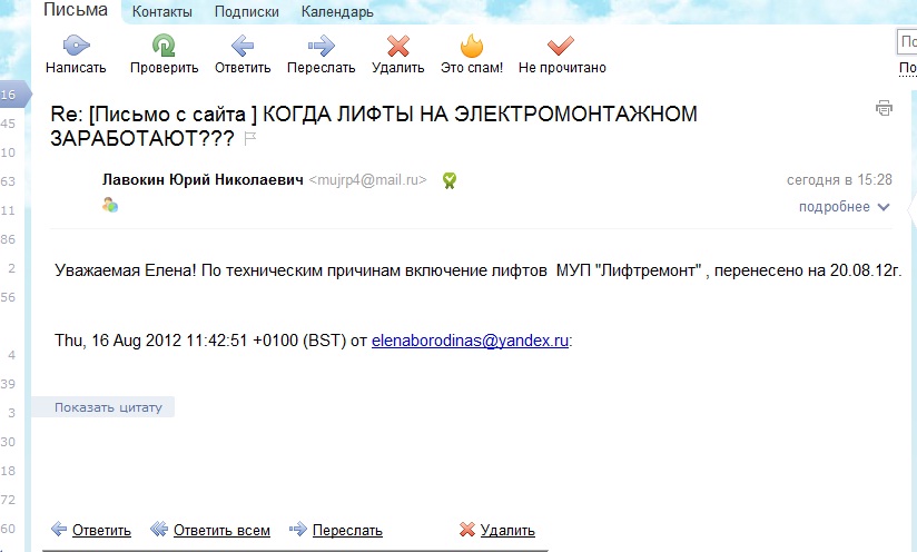 Сроки указать не рискнули?ls писал(а):Лифты не включили. По информации от Елены Александровны (секретарь МУЖРП) "сейчас ведутся работы на крыше". Как только удастся восстановить связь с диспетчерской, лифты будут включены.