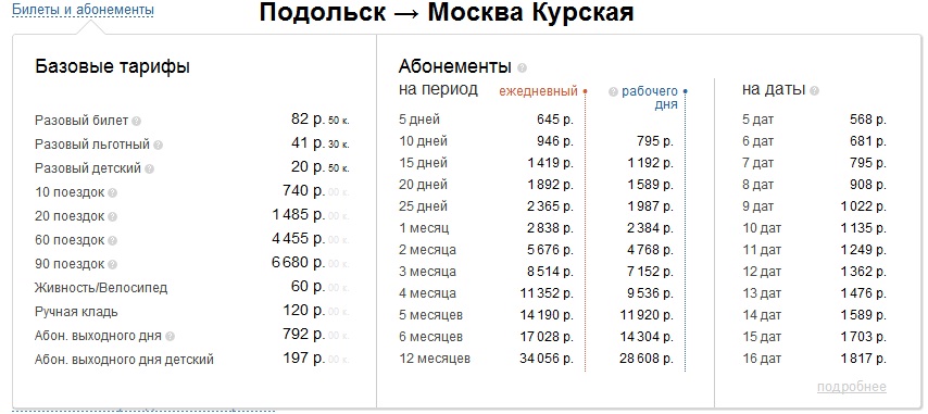 В то же время абонементы рабочего дня: Подольск <-> Щербинка = 693 руб. Бутово <-> Курский = 874 руб. Итого 1567 рублей.