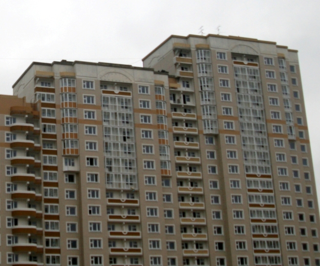 Я думала будет стекло снизу доверху, ан нет. Какие-то рыжие вставочки, не знаю что за материал. И вообще сегодня они активнее обычного работают, свет горит на первых этажах - поди, за подъезды взялись