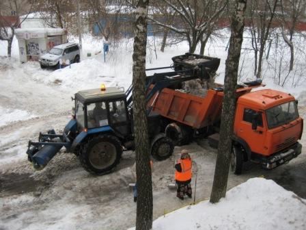 У нас вчера днем (пока машин было мало) весь двор подчистили. Сначало снег насыпали в самосвал, а когда он полный уехал, насыпали горы снега по-периметру...
