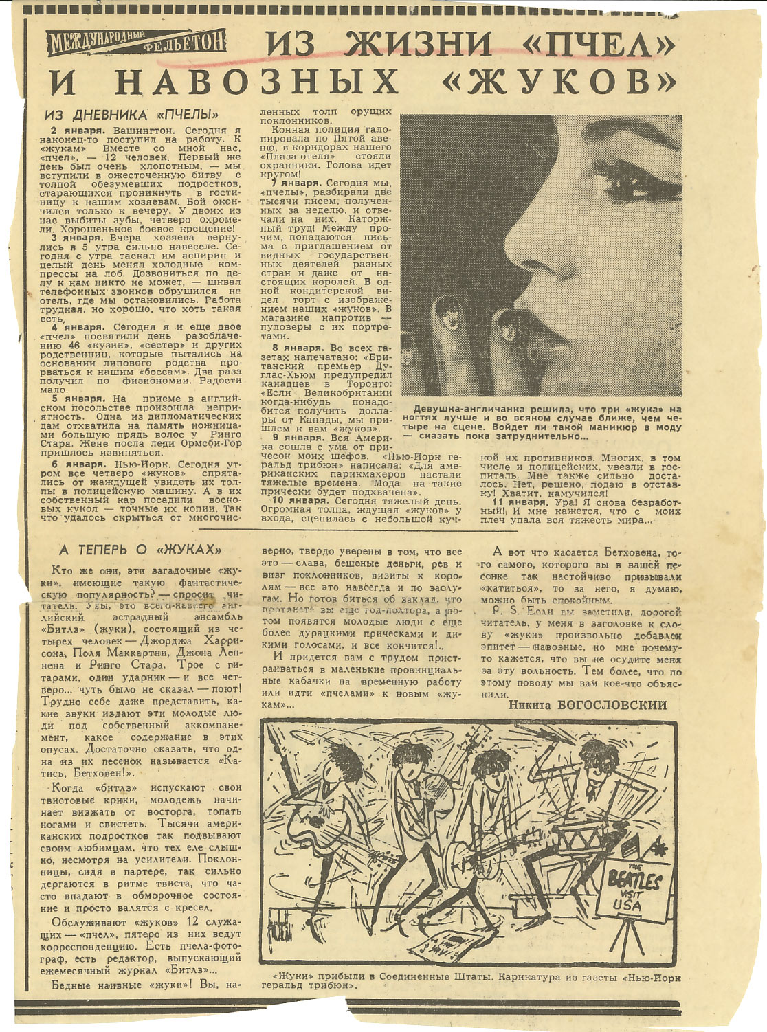 Кто же они, эти загадочные "жуки", имеющие такую фантастическую популярность? - спросит читатель. Увы, это всего-навсего английский эстрадный ансамбль "Битлз" (жуки), состоящий из четырех человек - Джорджа Харрисона, Поля Маккартни, Джона Леннена и Ринго Стара. Трое с гитарами, один ударник - и все четверо... чуть было не сказал - поют! Трудно себе даже представить, какие звуки издают эти молодые люди под собственный аккомпанемент, какое содержание в этих опусах. Достаточно сказать, что одна из их песенок называется "Катись, Бетховен!".