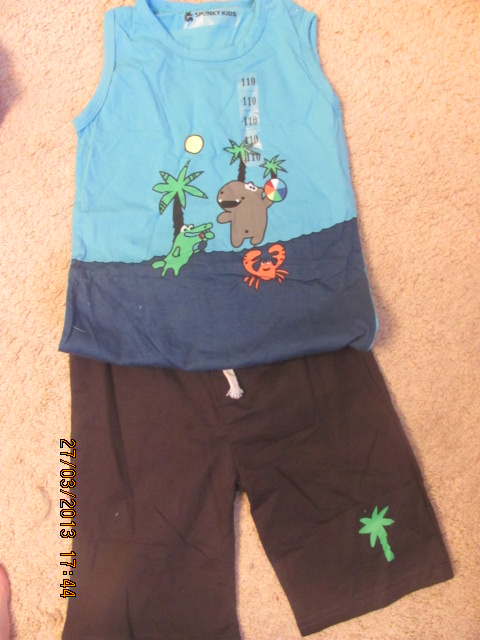 Костюмчик на мальчика трикотаж хороший,прошито все ровно,сбоку на маечке есть заклепочки, бриджики удлиненные