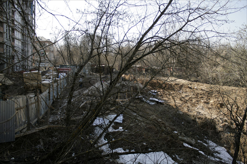 сохранившаяся нетронутой чистая северная часть Кузовлева оврага. место гнездования птиц. чуть выше - надвигающаяся стройка.
