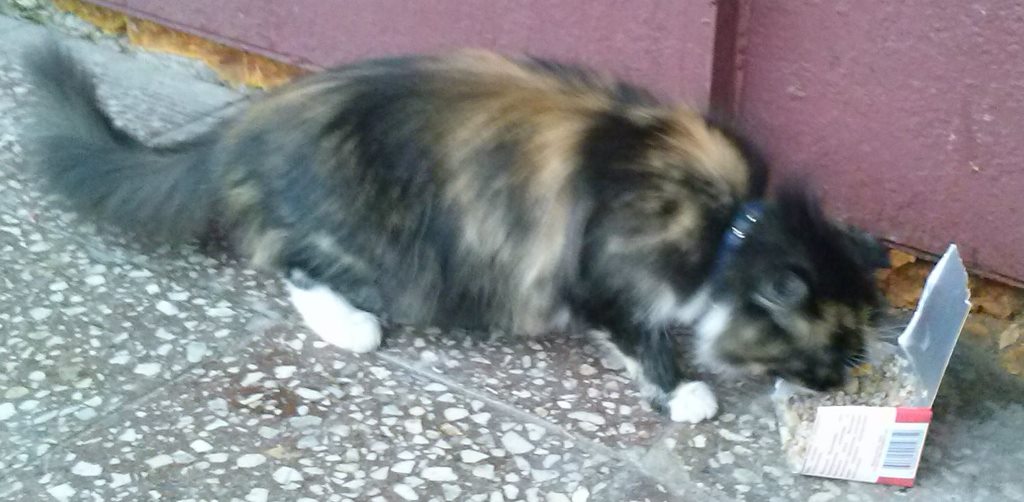 Кошка в нашем дворе появилась месяца два назад, соседи видели, как её принесла в сумке женщина, посадила на скамейку и ушла. Мы кормим с десяток дворовых кошек, одной больше - ничего страшного. Эта кошка среднего возраста трёхцветка с зелёными глазами, очень домашняя, очень ласковая, очень общительная и ручная. Она ни в какую не захотела идти в подвал, ночевала, когда пускали в подъезде, когда нет, то на лавочке, настолько она домашняя, что подвал не признаёт.