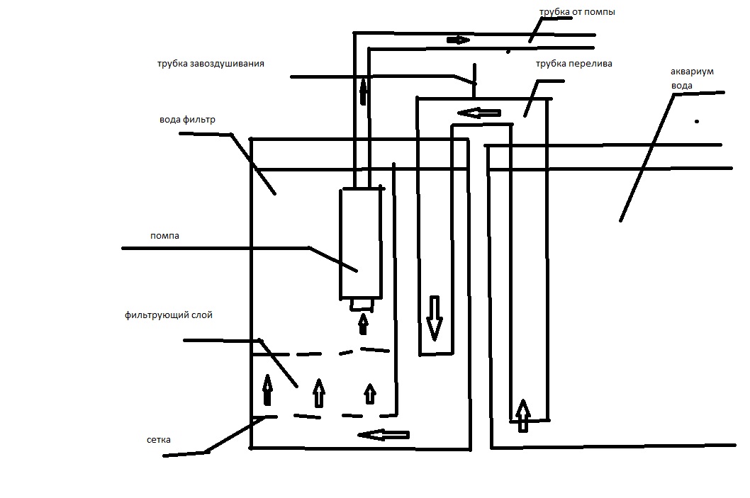 Вот, как смог, сделал схему. Что непонятно,спрашивайте. Ёмкость склеена из оргстекла. Высота равна высоте аквариума. Внутри поделена Г-образной перегородкой на две неравные части. Вертикальная часть приклеена к боковым стенкам,горизонтальная - сетка. На сетку укладывается фильтрующий материал.