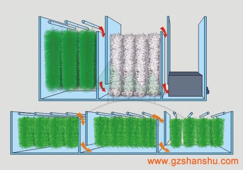 Если был бы фильтрующий мат из губки,то Г -образную перегородку я бы убрал и просто по всей высоте поставил бы губку.