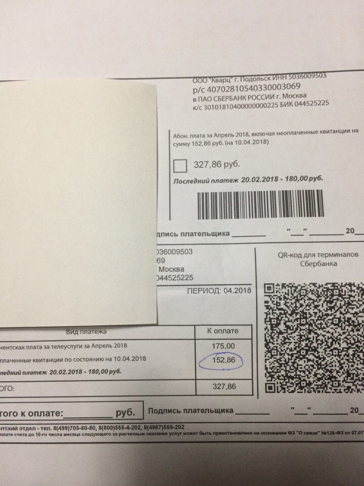 Прихожу, предъявляю квитанцию и готовлюсь показать оплаченные. Девушка посмотрела по моему ЛС, и сказала, что мне надо оплатить только 152р, я ничего не должна, якобы они в этом месяце как-то странно оформили квитанции, людям непонятно, и поэтому приходят разбираться. На мой вопрос, что такое неоплаченные квитанции, за которые долг, она сказала, что это вот эта самая квитанция, которую только что прислали. Ха! В квитанции ясно написано, к оплате 327р. Это не ошибка ни разу! Создается впечатление, что Кварц нарочно приписывает несуществующие долги, ведь многие не проверяют, и многие просто не хотят связываться из-за небольшой суммы