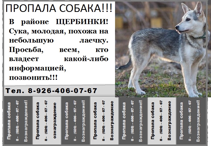 Алексей69 писал(а):Опять пропала .... 6-го мая , около 8-ми вечера в районе Южный (в Елочках) пропала собака породы Сибирский Хаски, черно-белый окрас, глаза разные. Если кто видел или знает ее местонахождение, прошу позвонить по тел.: 8 926 724 97 80.