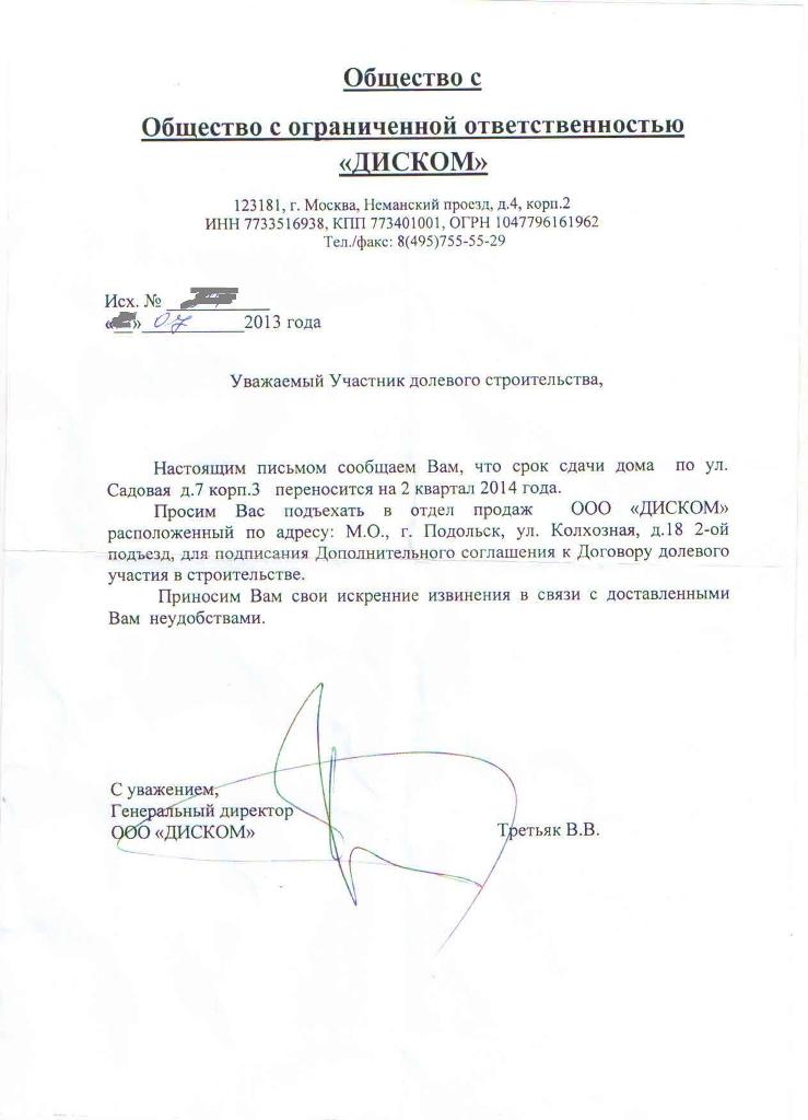 Сокол55 писал(а):Всем добрый день !Я одна из первых купила квартиру по Садовой 7 кор 3 .Срок указан не позднее 31 декабря 2013 и никакого письма о сроке переноса сдачи дома не было .И очень круто они подстраховываются , аж 2 квартал 2014 ставят , судя по письмам на форуме . Блин ., надеешься,планируешь .Мы чем виноваты , если они не успевают .Нервы не железные . :mad: