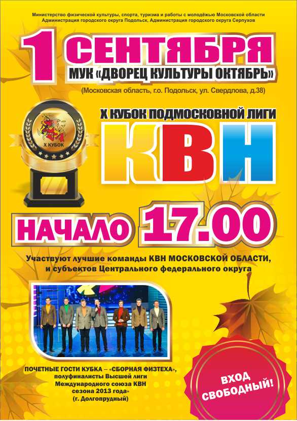 1 сентября 2013 года состоится 10-й Кубок подмосковной лиги Клуба веселых и находчивых. Подготовка к нему уже идет полным ходом. Команды пишут шутки и репетируют номера, чтобы в городе Подольске (ДК «Октябрь», ул. Свердлова, 38, 17:00) побороться за победу.