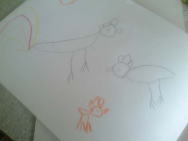 Рисует сейчас каждый день одно и тоже - маму,папу, себя, цветы и бабочек, солнышко, домик (все на одном листе)