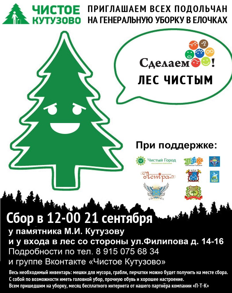 Подольчане, спешу напомнить, что 21 сентября состоится субботник по уборке лесопарка "Елочки".