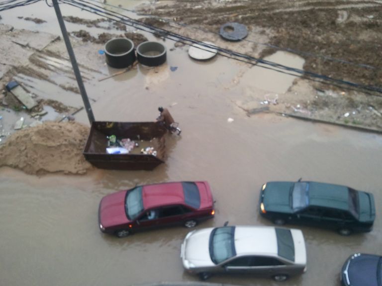 я подозреваю что лужа связана с появлением во дворе горы песка(на фото ее видно),если мне не изменяет память то решетка слива находится под ней,ведь до появления этой кучи такой лужи не было,хотя дожди тоже были.