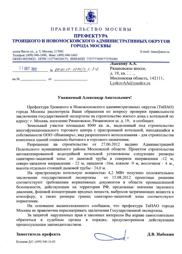 Если вдруг кому-то понадобится - ответ зам.префекта ТиНАО:
