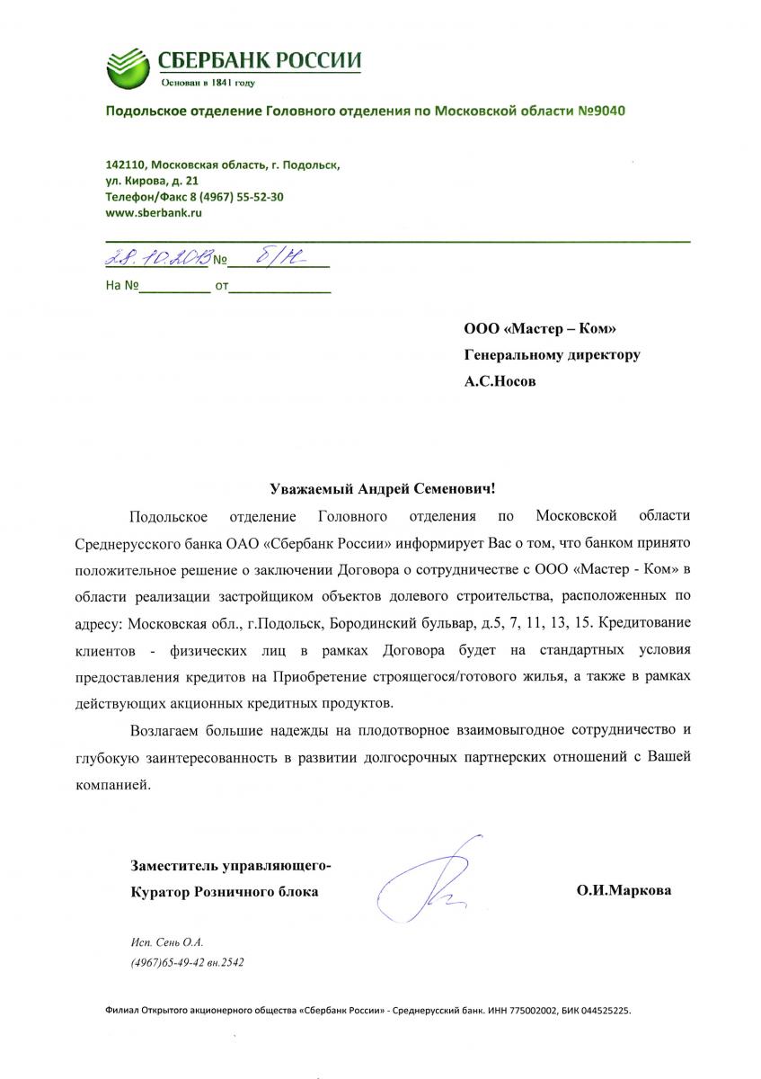 Головное Отделение по Московской области Среднерусского Банка ОАО «Сбербанк России» и Подольское отделение № 2573, подтвердили предварительную аккредитацию объекта.