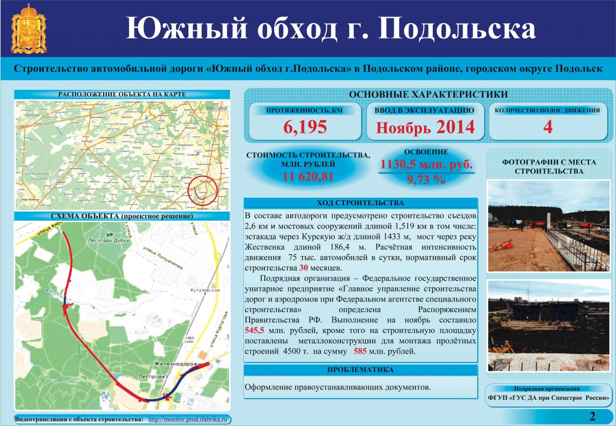 Продолжаются работы по строительству «Южного обхода Подольска», ввод в эксплуатацию которого запланирован на ноябрь следующего года. Расчётная интенсивность движения по четырёхполосной автодороге составит 75 тысяч автомобилей в сутки. Стоимость строительства объекта составляет 11,6 млн рублей.