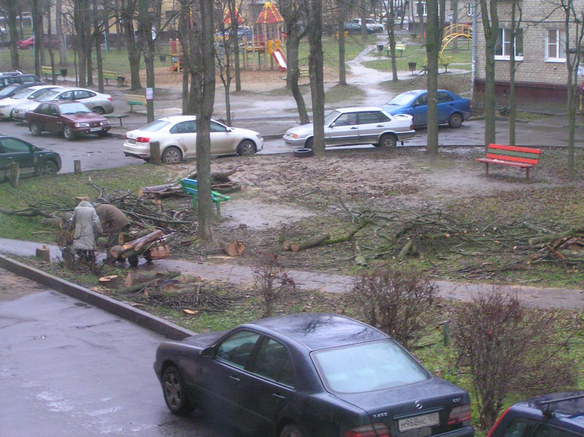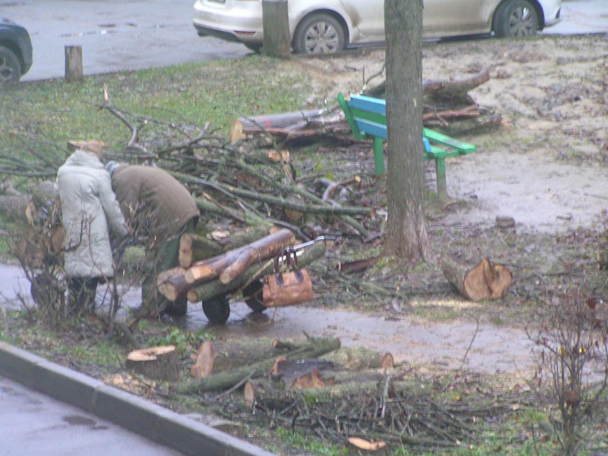 Большинство людей в будни днем на работе, а именно в это время все и происходит. Приезжаешь домой вечером и видишь уже результаты (пеньки и груды веток).