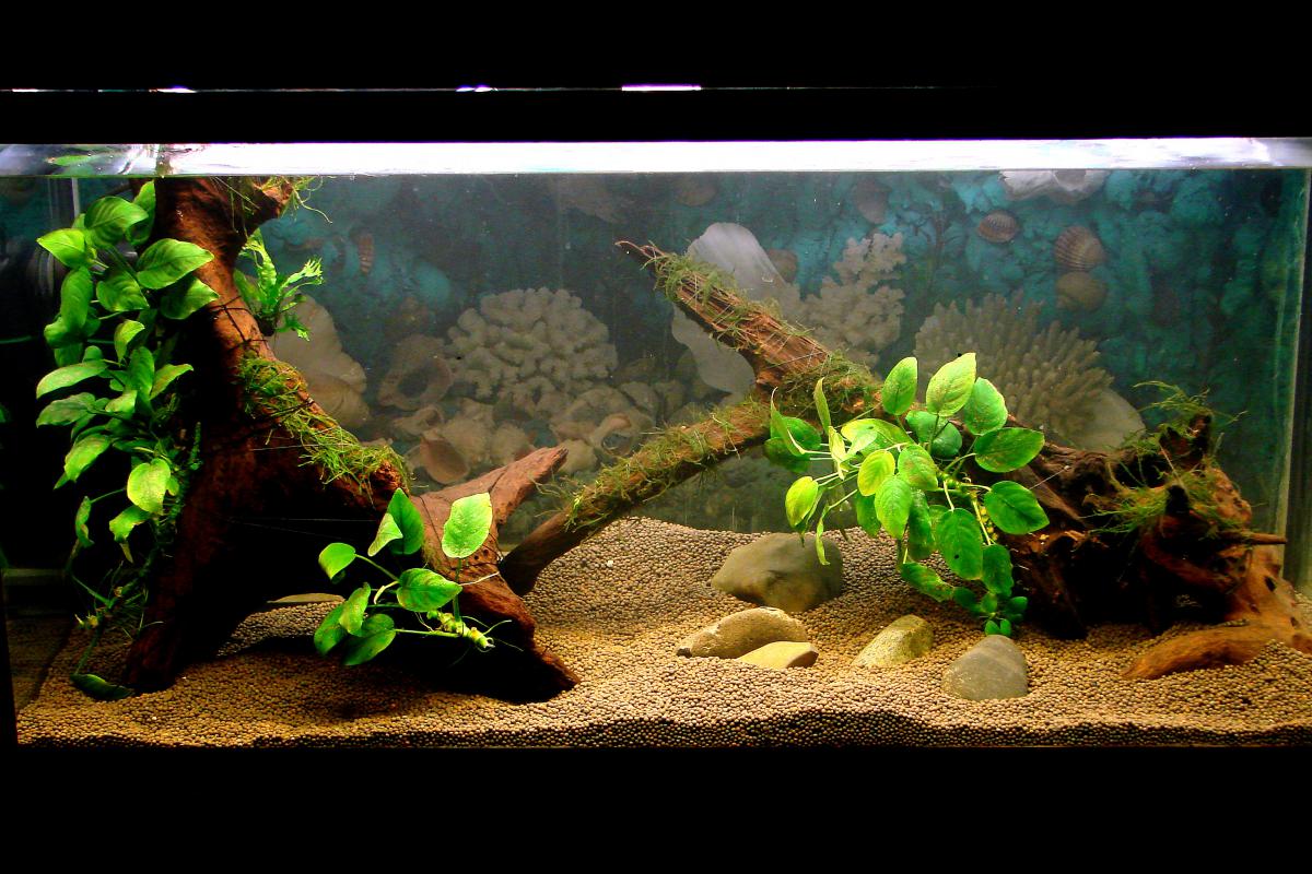 А водичка очистилась, стала прозрачной без всякой химии. Может кто-то скажет: "Вот обещал аквариум без фанатизма, а теперь сплошные проблемы и растраты!" Проблемы могут возникнуть в самом крутом аквариуме, а так же в самом, что ни на есть, бюджетном. Вопрос в способах решения этих самых проблем. Я не применяю ни каких тестов и анализов воды, не использую дорогостоящих методов для её очистки и подготовки. Растраты,- тоже вопрос риторический. У меня банка на 200 литров и я физически не могу сделать что-то путёвое с маленькой коряжкой или обойдясь 5 кг. грунта! Если Вы решили завести рыбок в 50 литровом аквариуме, то делите сумму моих затрат примерно на 5, если в 20(меньше нет смысла) литрах, то есественно на 10. Подобъём "бабки", извините за жаргон. У меня: 2коряги по 1150 рублей = 2300, грунт 30 кг. = 2616. Всё!!! 4916 руб. - это на 200 литров и на мой придирчивый вкус. Можно и без коряг и без грунта из магазина! В принципе мой аквариум и жил 10 лет без этих "изысков". Водились в нём и золотые рыбки и цихлиды, которые регулярно приносили потомство, и астронотусы с парчёвыми сомиками, которые вырастали до таких размеров, что не помещались в ведро, когда я их решил сдать в зоомагазин, потому что они постепенно стали съедать весь мой семейный бюджет. Всё это время я совершенно не знал и не заморачивался различными параметрами внутренней среды моего водоёма. Для меня была безразлична кислая, нейтральная или щелочная вода в аквариуме. Какова ёе общая или карбонатная жёсткость. Сколько в ней нитратов, нитритов, фосфатов и прочей гадости. Сейчас, запуская аквариум, я тоже не буду интересоваться и применять достижения нашей современной химикофармокологической промышленности. Имея кой какой опыт в аквариумистике я уже прошёл метод проб и ошибок и сейчас прсто хочу быстрее запустить свой аквариум. Всё это не так сложно как может показаться на первый взгляд. Я не ретроград, но аквариумы в наших домах были ещё при царе горохе, когда и слыхом не слыхивали ни о каких прибомбасах существуищих сейчас, и с успехом впариваемых нам гигантами китайской, японской, германской и прочих стран, промышленности. Были! Радовали глаз!