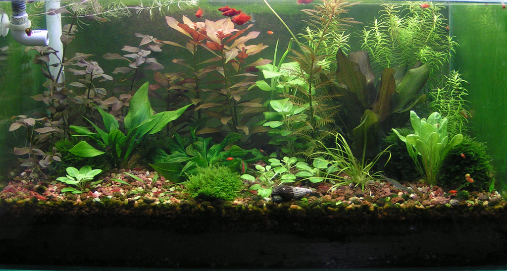 Помимо меченосцев, прекрасно адаптировались пецилии-баллоны, кркветки вишни и пара анциструсов. Собирался содержать другой состав рыб, но эти красные меченосцы так гармонично смотрятся на фоне зелёной травки, к тому же занимают практически все слои аквариума, что я пожалуй доволен и этим.
