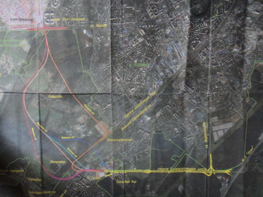 Эта карта попала в наши руки после встречи со строителями осенью прошлого года и вот только теперь появилась техническая возможность её опубликовать. Карта будет интересна всем местным жителям, интересующимся данной проблематикой, и представляет собой иллюстрацию того, как развивалась извращённая обходная мысль бездарных проектировщиков.
