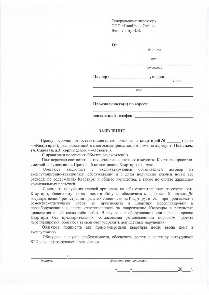 Я еще не консультировался с Ними что за заявление мне предлагают и когда подписать, о досрочном вселении.