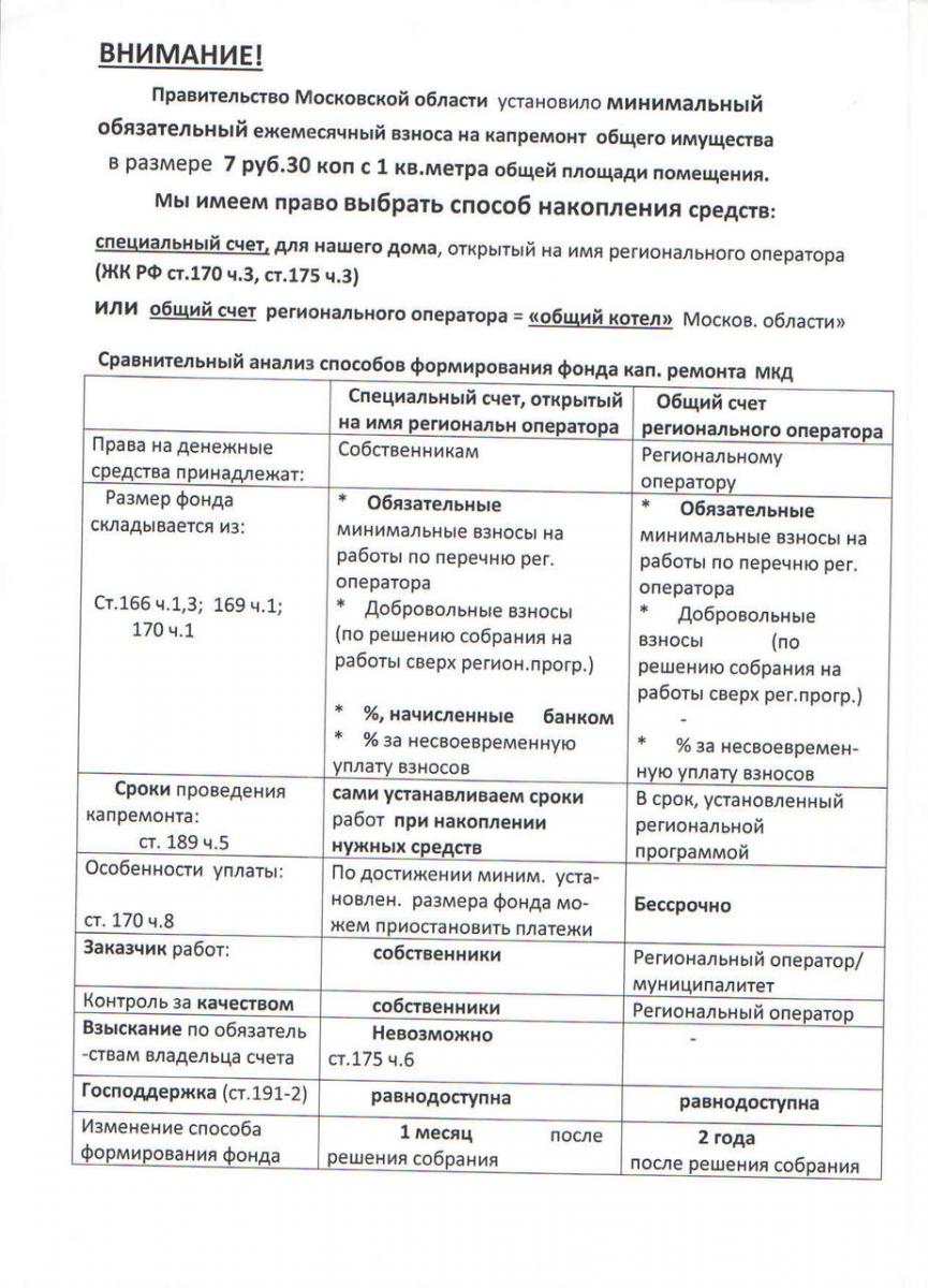 Пообщались с соседями, решили провести собрание, собрать подписи и решить открыть специальный счёт для дома от имени регионального оператора. Чтобы деньги шли не в общий котёл, а только на наш дом собирались на специальном счёте.летучка писал(а):До 1 апреля 2014 г. на общем собрании собственников помещений дома Вы должны принять решение о способе формирования фонда капитального ремонта на специальном счете либо на счете регионального оператора.