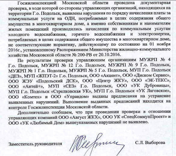 После проведения документарной проверки в адрес управляющей компании ООО «ОАО Дубровицы» выдано предписание о перерасчете платы по ОДН всем собственникам 33 домов, находящихся в управлении данной организации в городском округе Подольск.