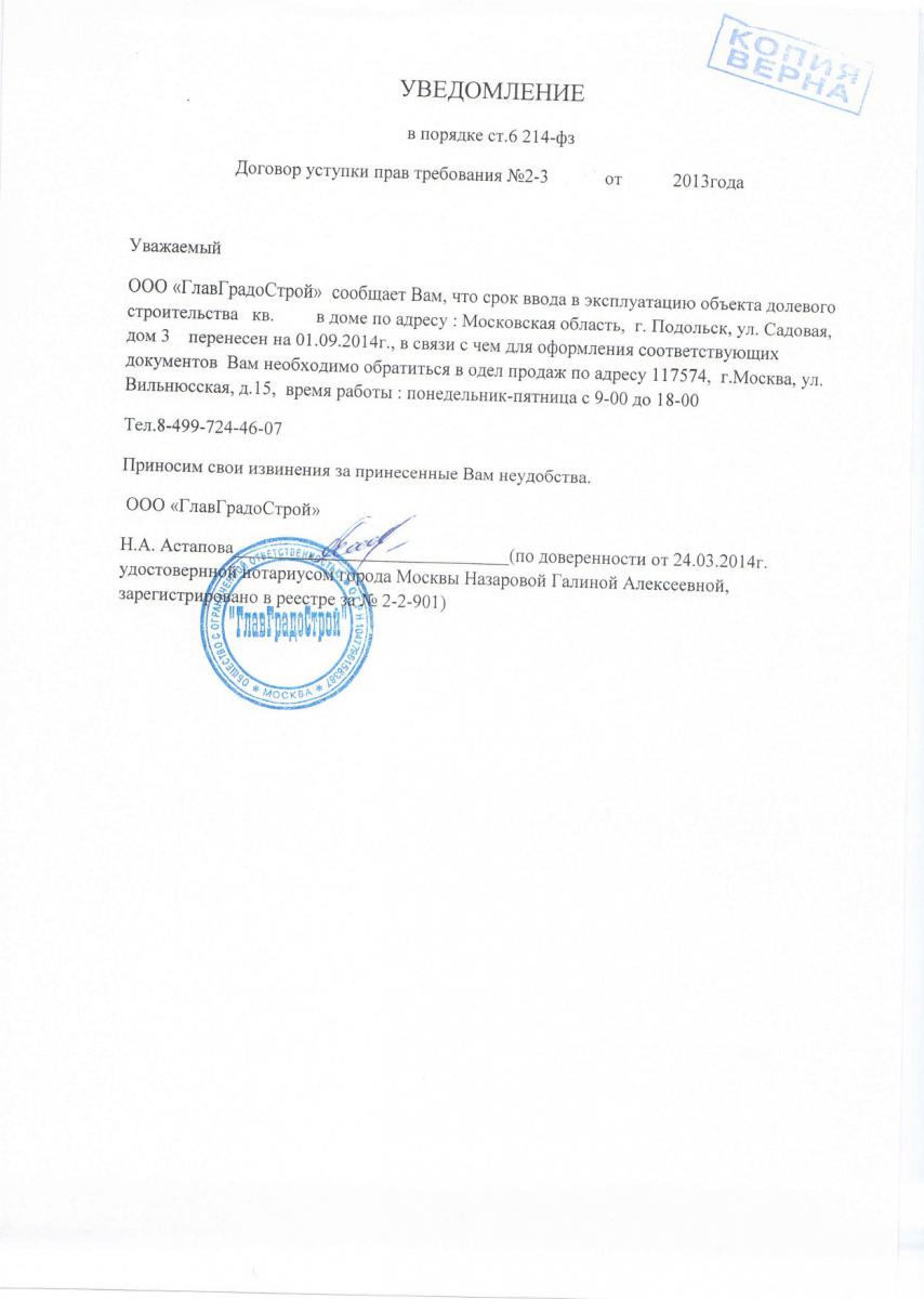 У меня был договор уступки прав требования (как у всех насколько я понимаю). Срок также стоит май 2014, но там написано что ГГС не позднее чем за 2 месяца до окончания срока должен уведомить о переносе сроков. Я уточнила не получали ли уведомления, потому что 25/03 уже было 2 месяца. Девушка ответила, что срок перенесли на 1/09, что уведомление ГГС Гермесу отправлять не будет, поскольку они "одна компания". Но мне такое уведомление вручат после оплаты с оригиналом ДДУ выданное на имя Гермеса 25/03.