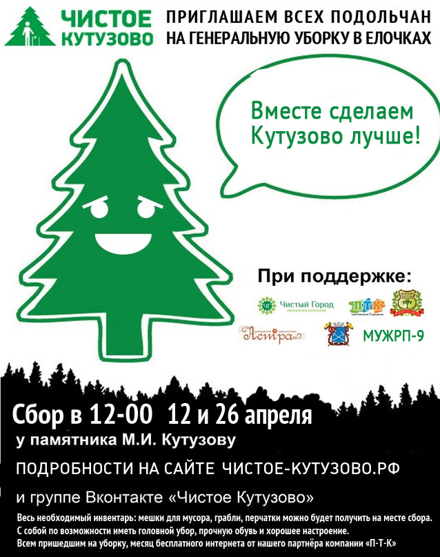 Доброго времени суток всем, "Чистое Кутузово" планирует сделать два субботника 12 и 26 апреля, подробности сообщим дополнительно.