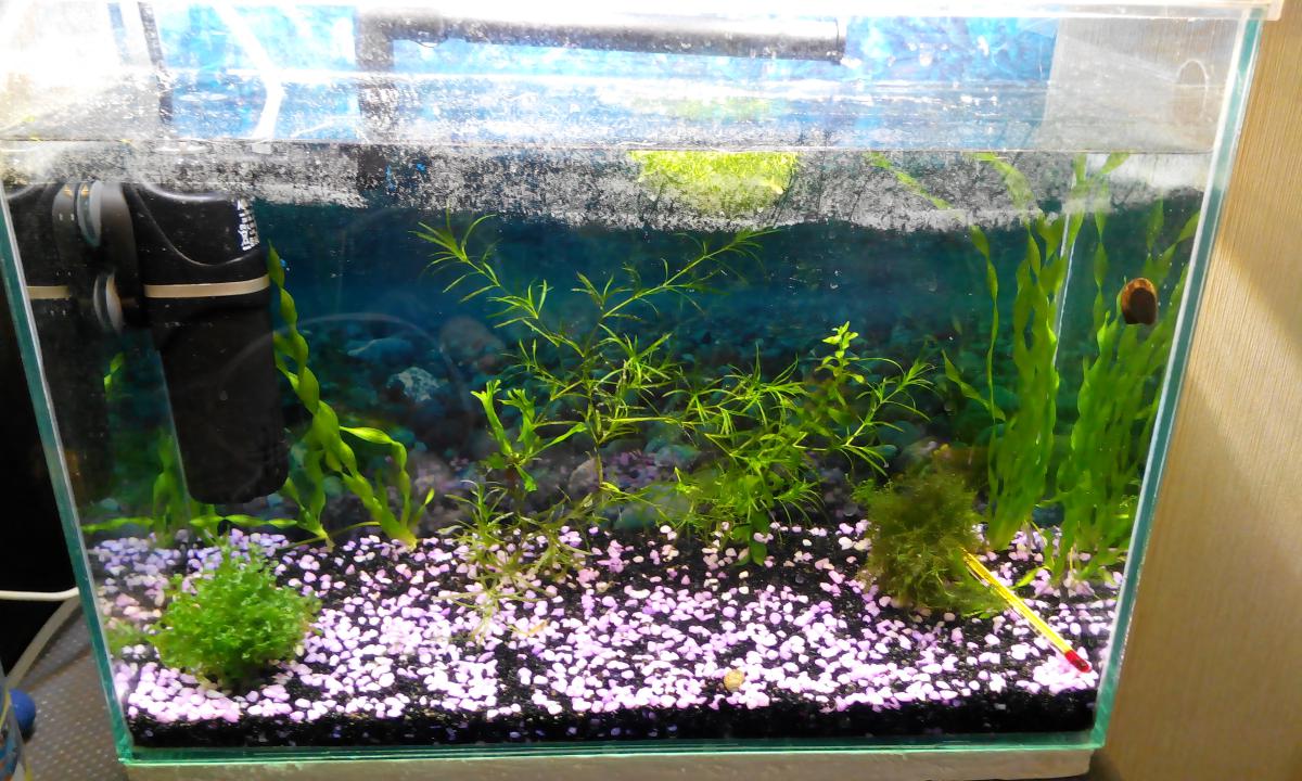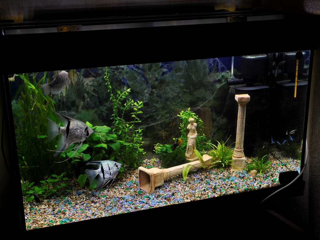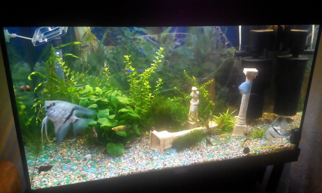 (Почему мало света: изначально покупались разные растения, нормально прижилось два вида, видимо самые неприхотливые.. а сейчас уменьшила световой день с 12 до 10 часов - загнулись окончательно остатки других видов и начали дохнуть рыбы массово. Даже роголистник совсем захирел.)