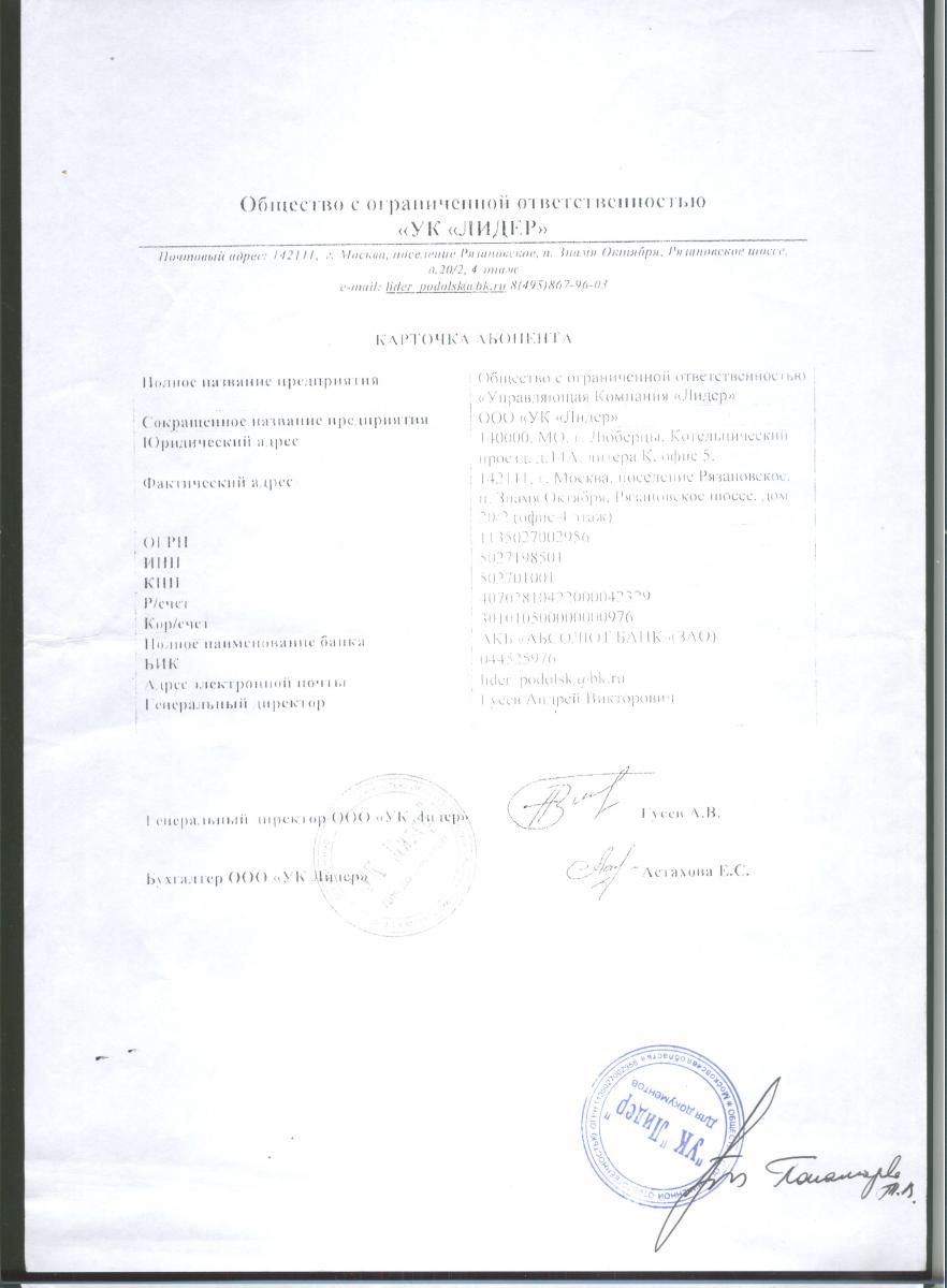 Подпись Гусева увидел в карточке, она совсем не соответствует подписи в моем договоре с УК, встает вопрос и о его юридической силе.ALE)( писал(а):В том то и дело, что никто не видел ни приказов, ни устанвных документов,ни документов что именно ук лидер имеет те реквизиты,что нам всовывают для оплаты, а сформировать карточку предприятия и шлёпнуть печать не составляет труда. Печать делается по отттиску 3т.р. А при том, что ТВ не известно кто такая фактически, значит и все документы не несут никакой юридической нагрузки.aleks17ru писал(а):А у тв есть право подписи ?