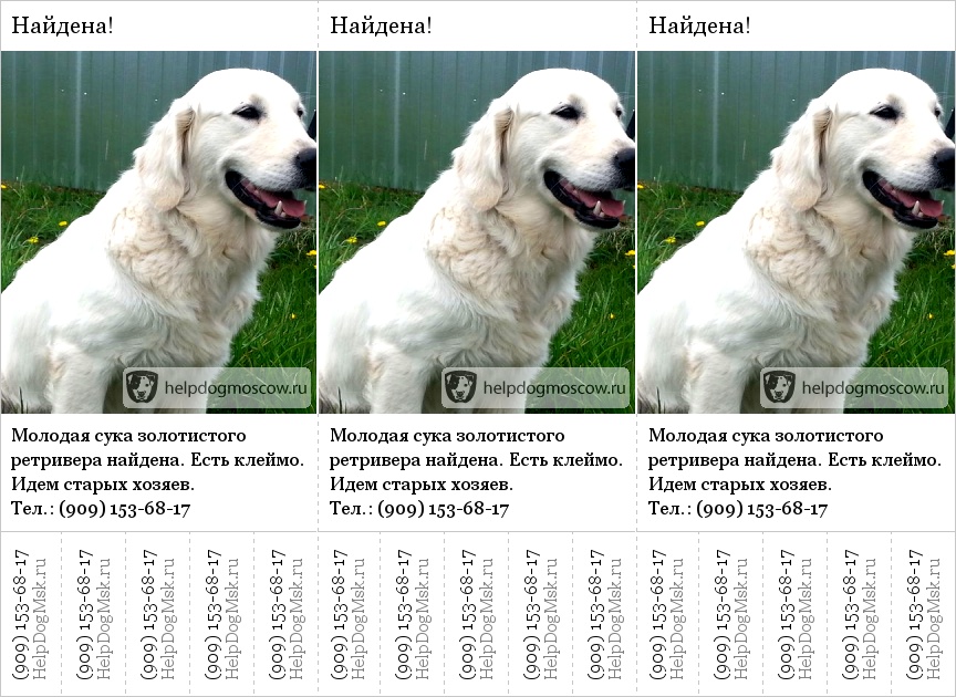 Случайная прохожая писал(а):05.05.14 в Чеховском районе найдена сука золотистого ретривера, молодая (около года), с клеймом.