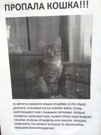 Пропала (Найдена) кошка(кот), порода, цвет, город, улица, район