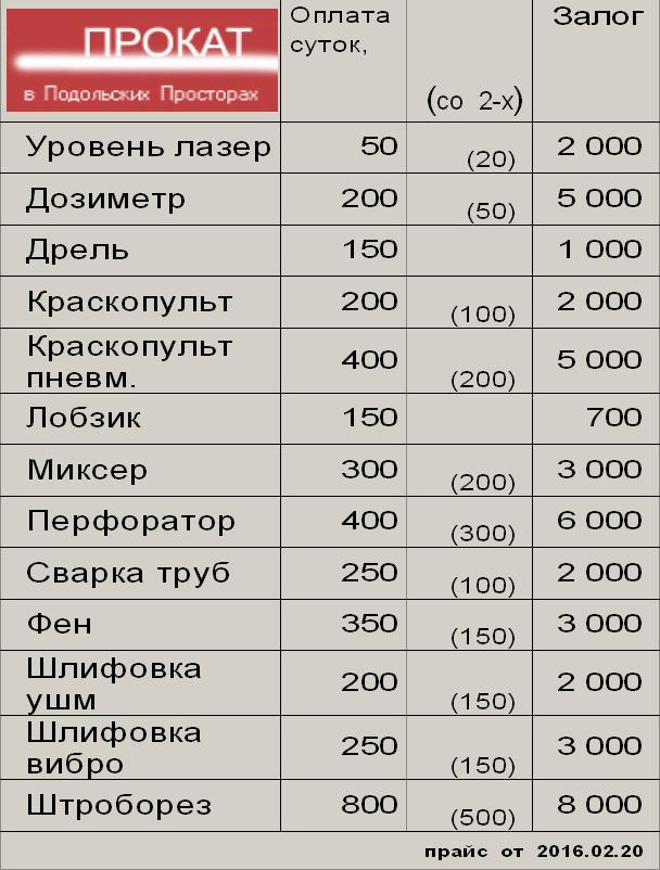 "Посуточный прокат, аренда электроинструмента в Подольских просторах: перфоратор, штроборез, дрель ударная, лобзик, миксер, краскопульт, пульверизатор, шлифмашина ушм (болгарка), вибро шлифмашина, фен-термопистолет, сварка пластиковых труб, дозиметр, уровень...