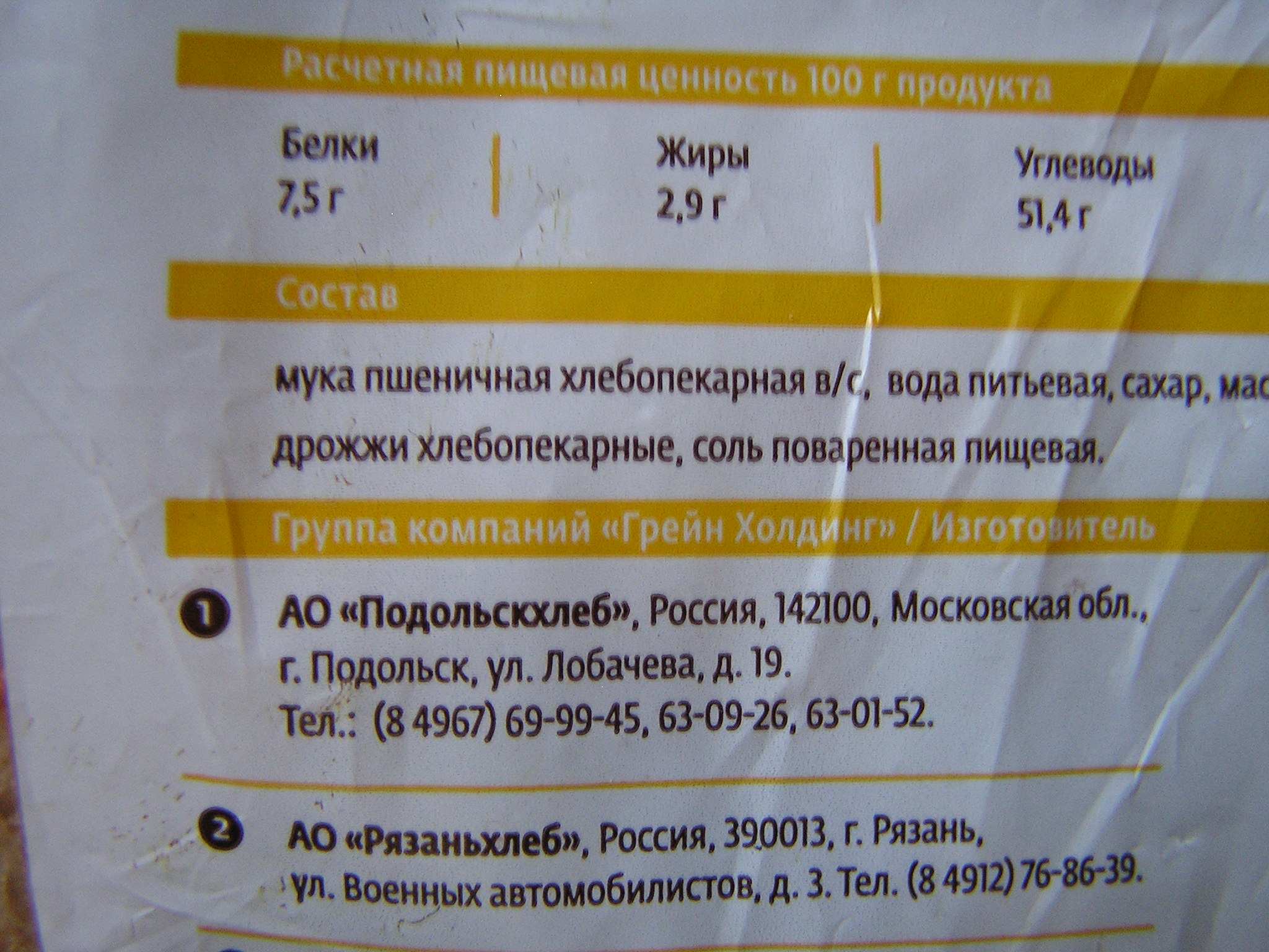 В запаянной упаковке, насколько я помню, "Нарезной" "Грейн-холдинга" бывает из партии, сделанной на Подольском хлебокомбинате в Москве на ул. Лавочкина (в строке с датой изготовления в этом случае приписывается циферка 3; если изготовлено в Подольске на ул. Лобачева, обозначается цифрой 1). Единичка встречается чаще, тройка реже (например, время от времени в "Магните" "Нарезной" "Грейн-холдинга" (цельный, нерезаный) бывает с ул. Лавочкина).