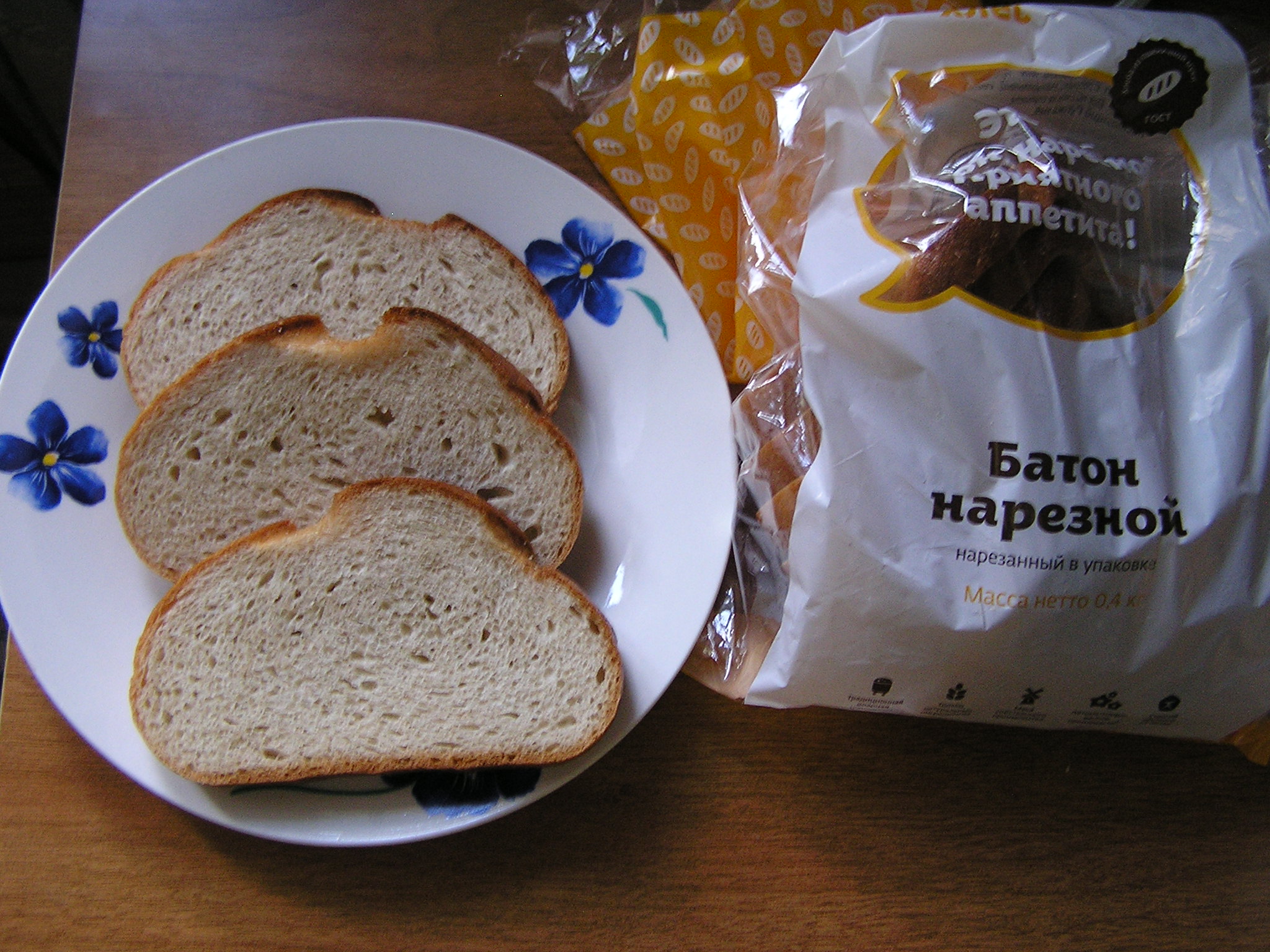 Для обычного нарезного батона ингредиенты очень простые, на самом деле: мука высшего сорта, соль, сахар, вода, дрожжи натуральные, масло. Испортить трудно, если не заменять и не удешевлять. pardon: