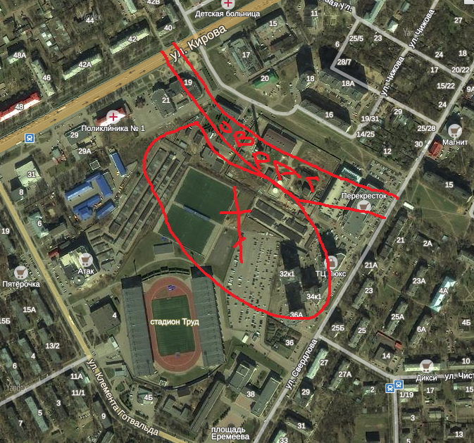 Сейчас на этом месте торговый центр построили, а жёлтый дом стоит рядом с бывшим кладбищем, вопреки разговорам о том, что посроено на самом кладбище.
